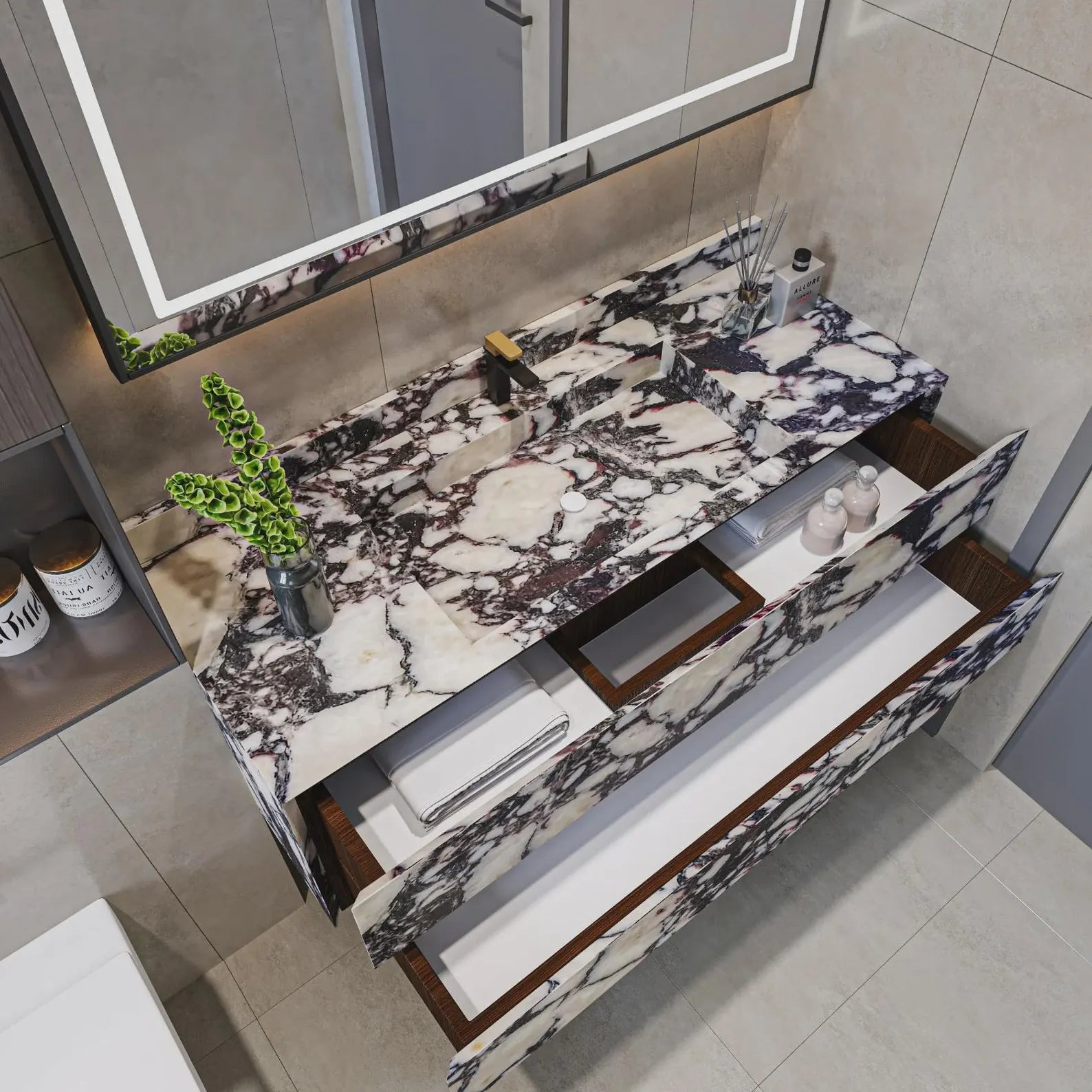 Featuring an integrated marble basin and premium soft-close hardware, this vanity console delivers both visual impact and everyday convenience. Fully customizable, it allows you to create a vanity sink perfectly suited to your spatial requirements and interior style.