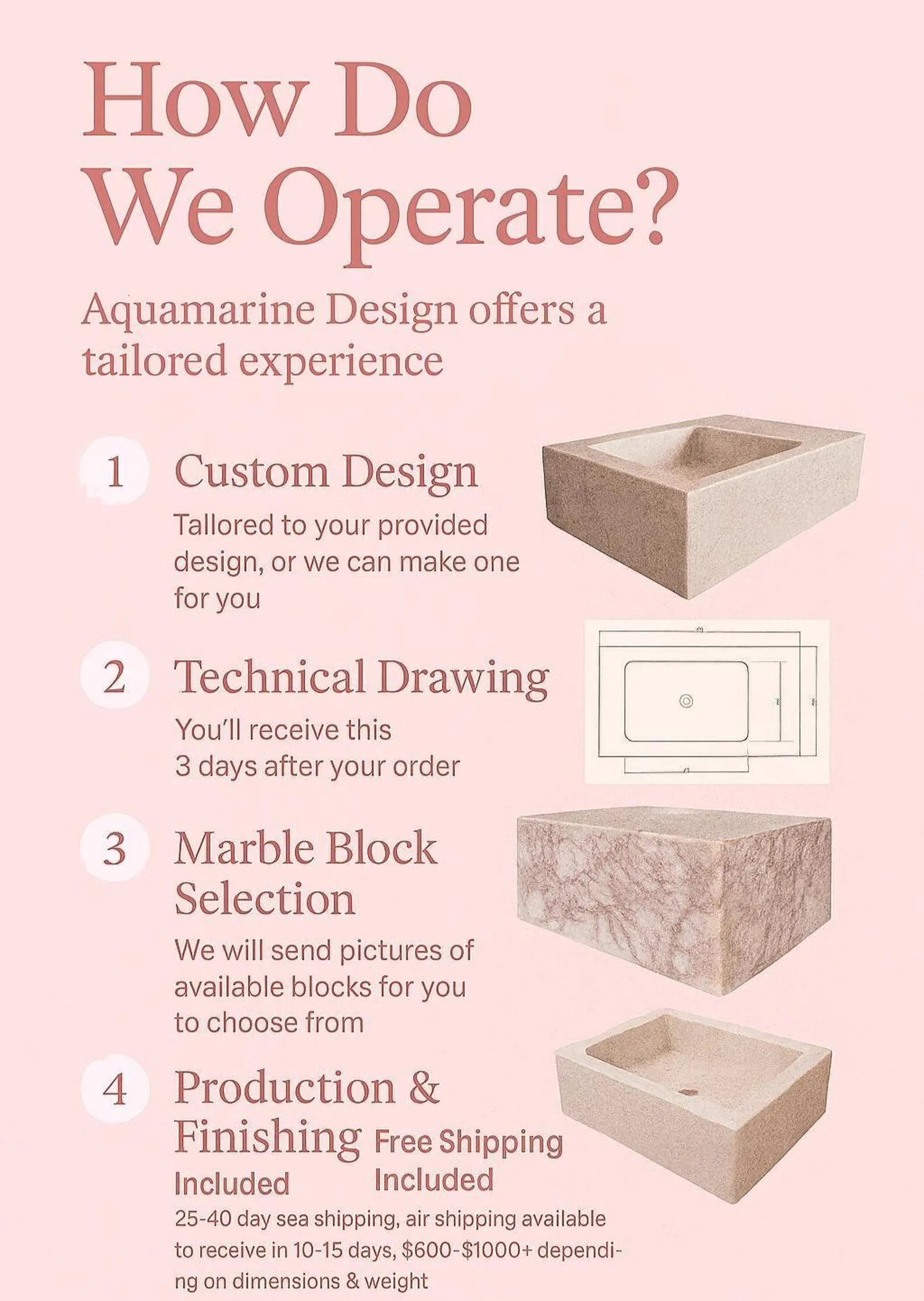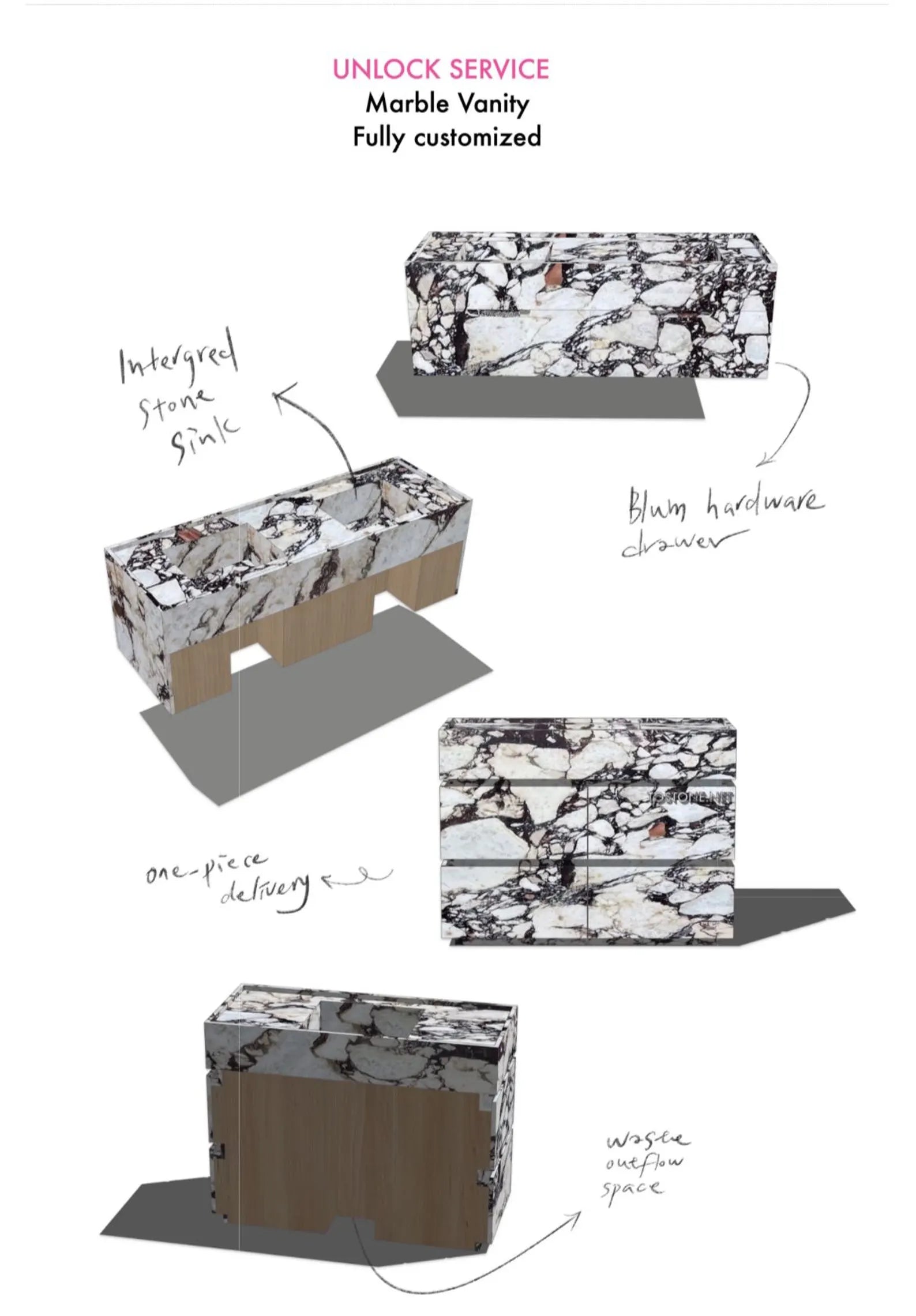 🪨 Material Options: Custom marble selections including Calacatta, Arabescato, Travertine, Rosso Levanto, Onyx, and more