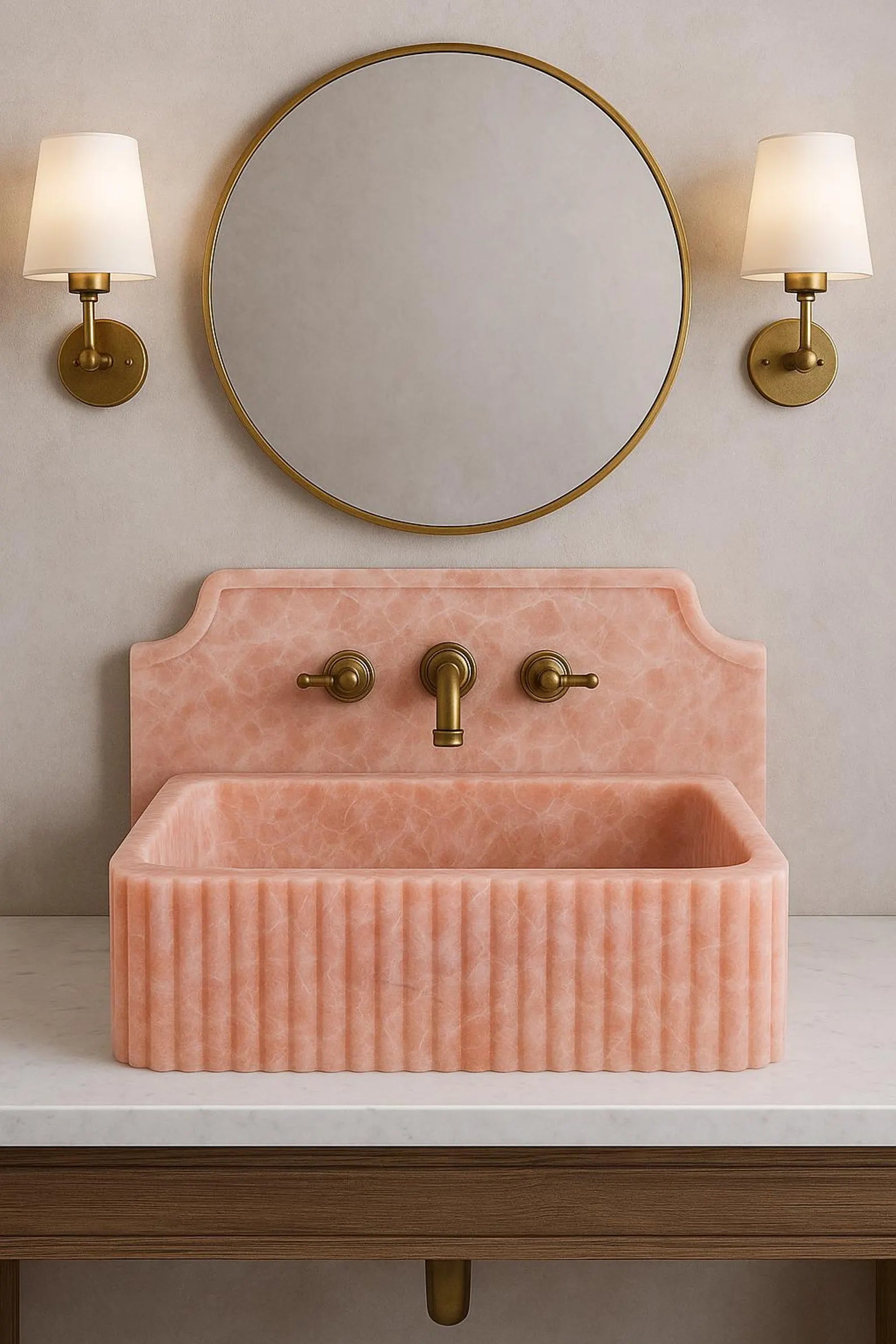 Refine your bathroom interior with this wall-mounted vanity sink crafted from honed pink onyx marble, designed to balance natural beauty with architectural simplicity. The soft matte surface highlights the stone’s organic veining and warm tonal depth, creating a sophisticated focal point without overpowering the space.