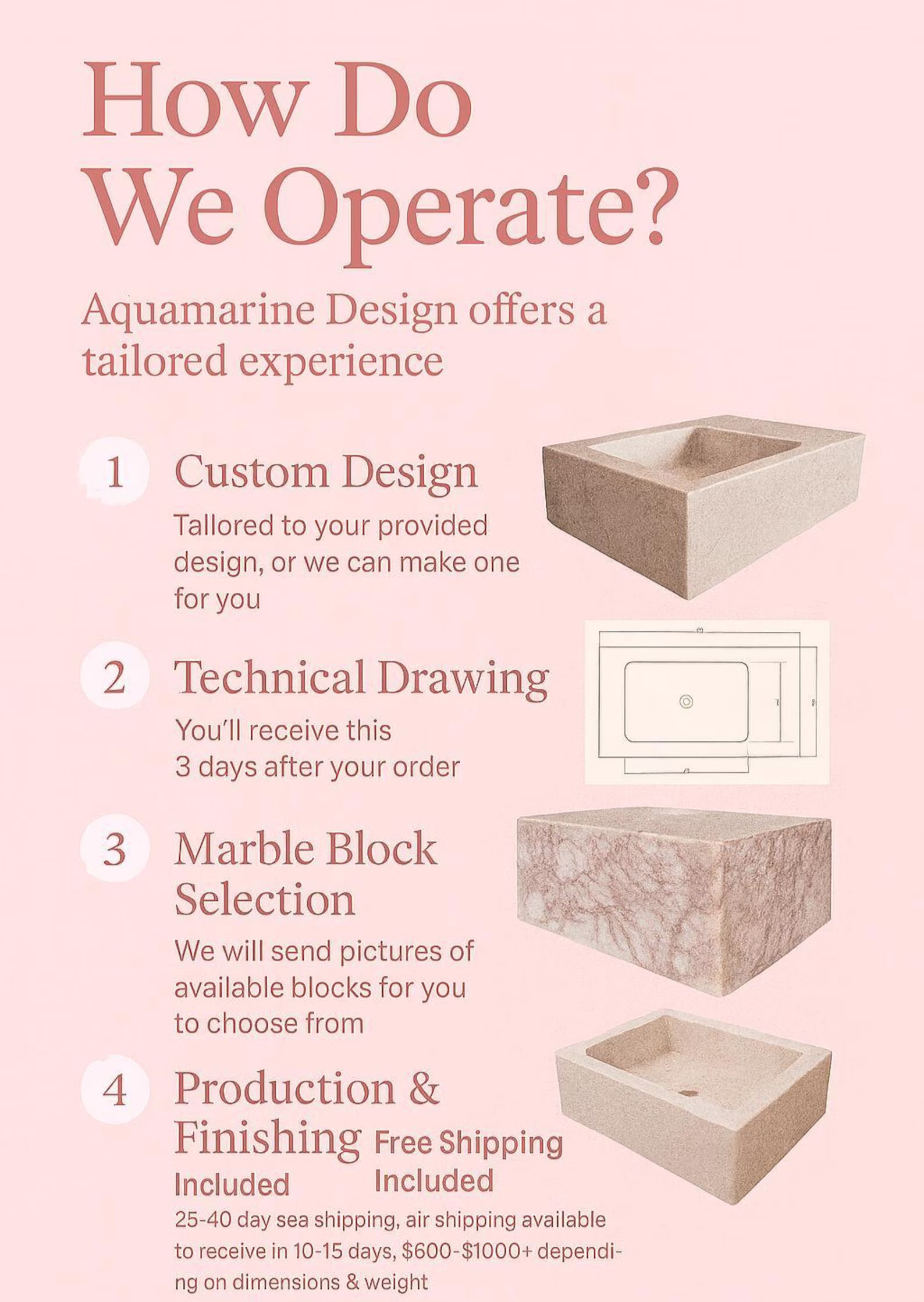 Handcrafted from 100% natural Arabescato Rosso marble, each sink is unique, showcasing the stone’s distinctive patterns. Polished or honed to perfection, the finish enhances the natural beauty of the marble while ensuring durability and long-lasting appeal. Designed for both modern and classic settings, this vanity sink combines functionality with artistic craftsmanship.