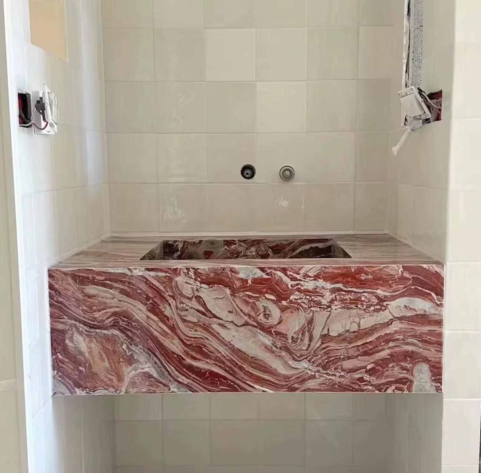 Elevate your bathroom with this luxurious Red Marble Bathroom Vanity Sink, a striking centerpiece designed to bring timeless elegance and sophistication to any space. Featuring bold red and white natural veining, this marble basin transforms bathrooms, powder rooms, or vanity areas into refined, high-end interiors.