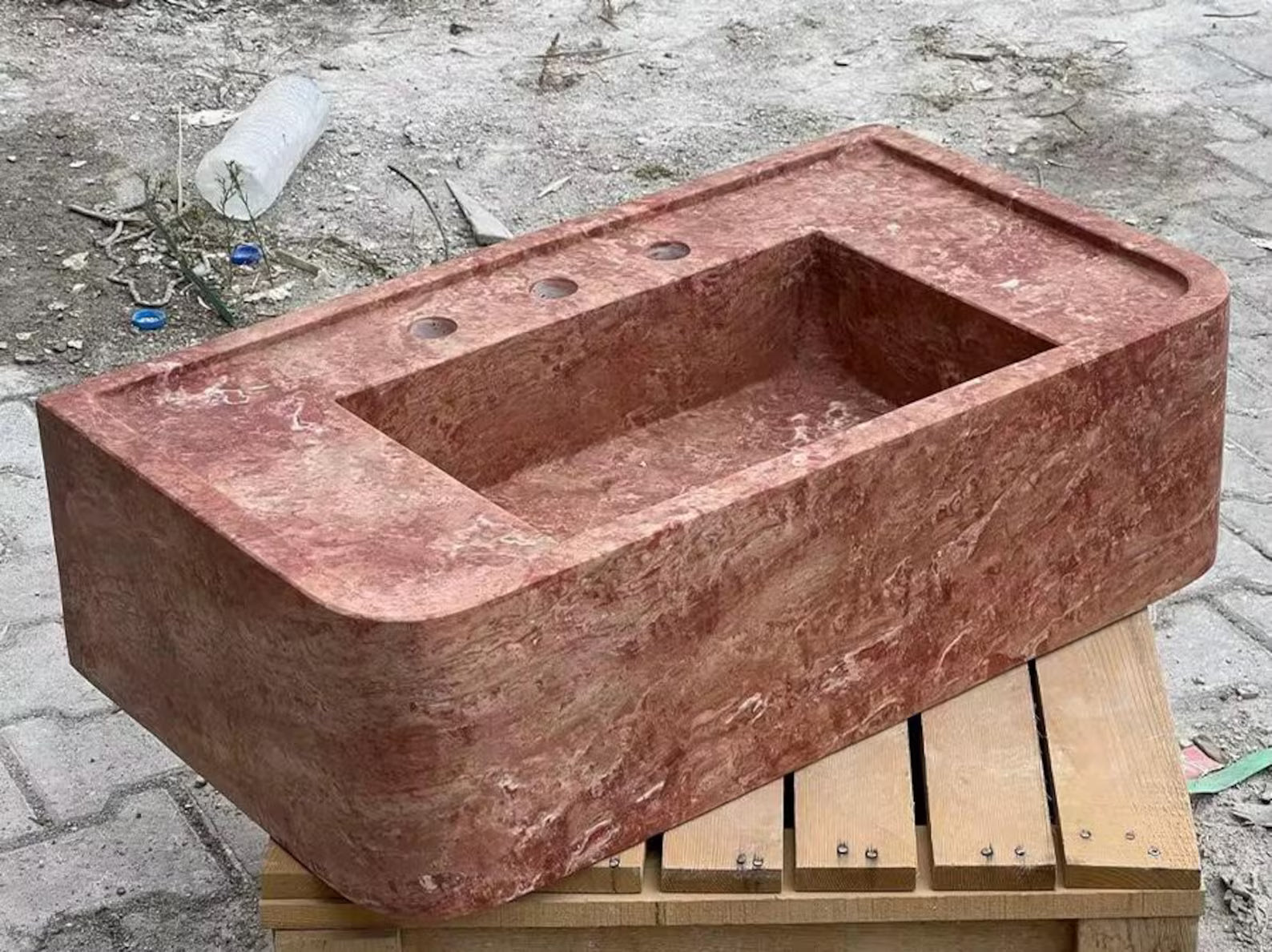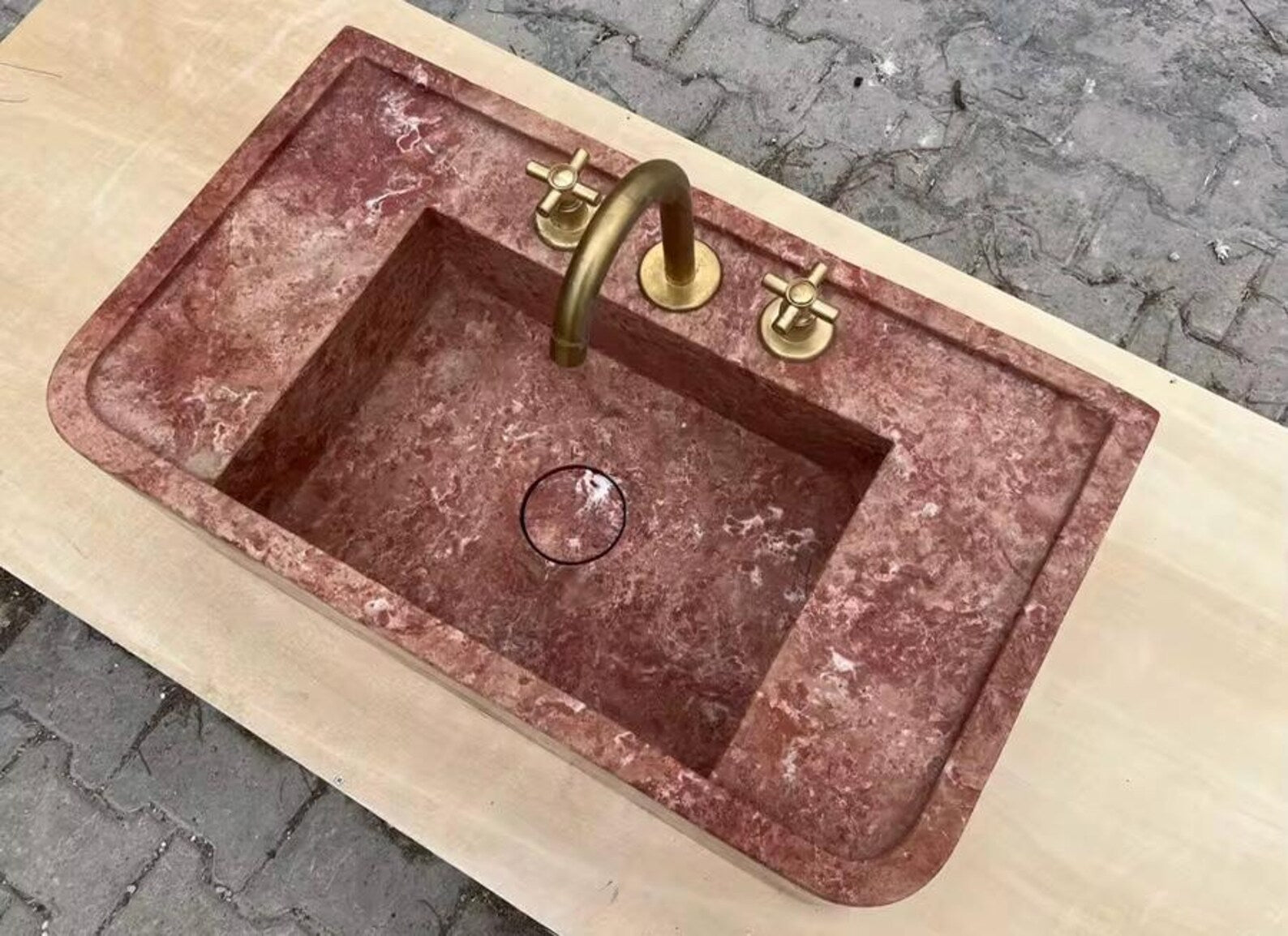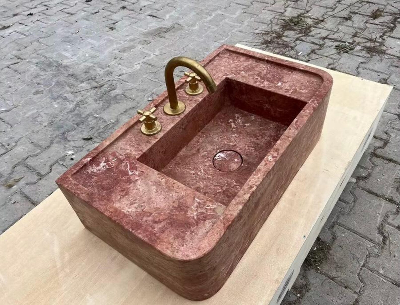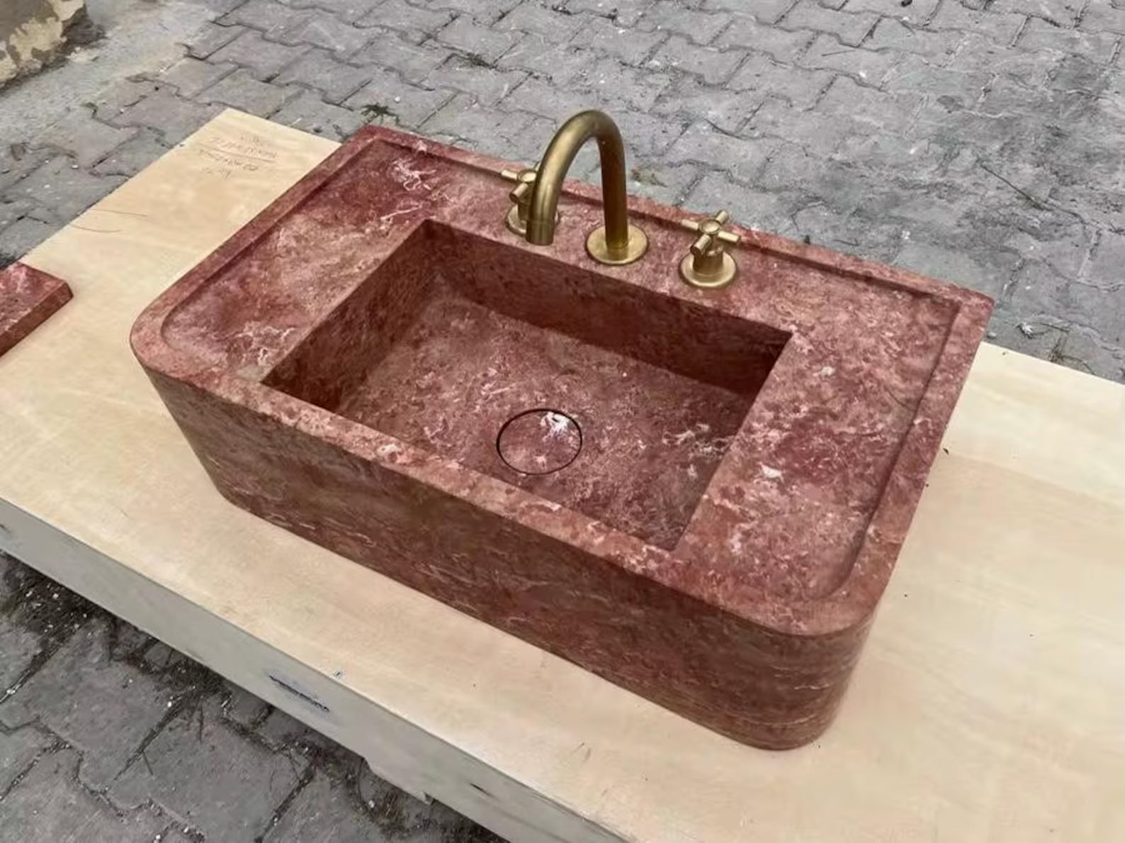 Elevate your interior with this Rosso Levanto marble sink, crafted to bring timeless elegance and bold character to your bathroom or vanity space. The rich red tones and natural veining of genuine marble create a striking focal point, making this custom sink perfect for high-end interiors, modern bathrooms, and designer powder rooms.