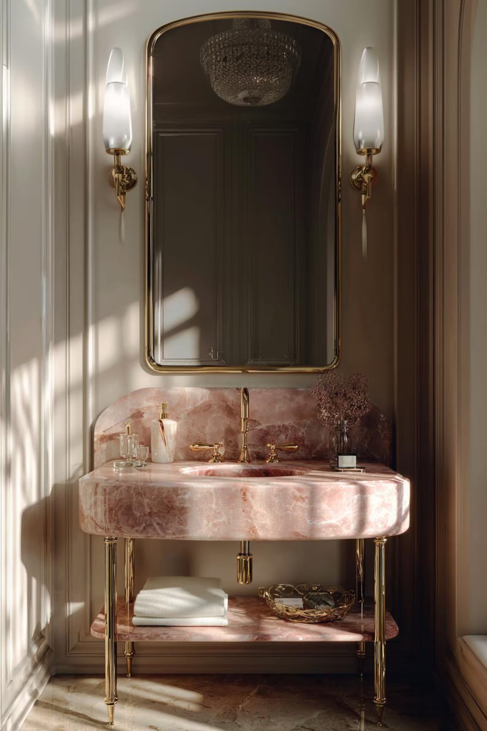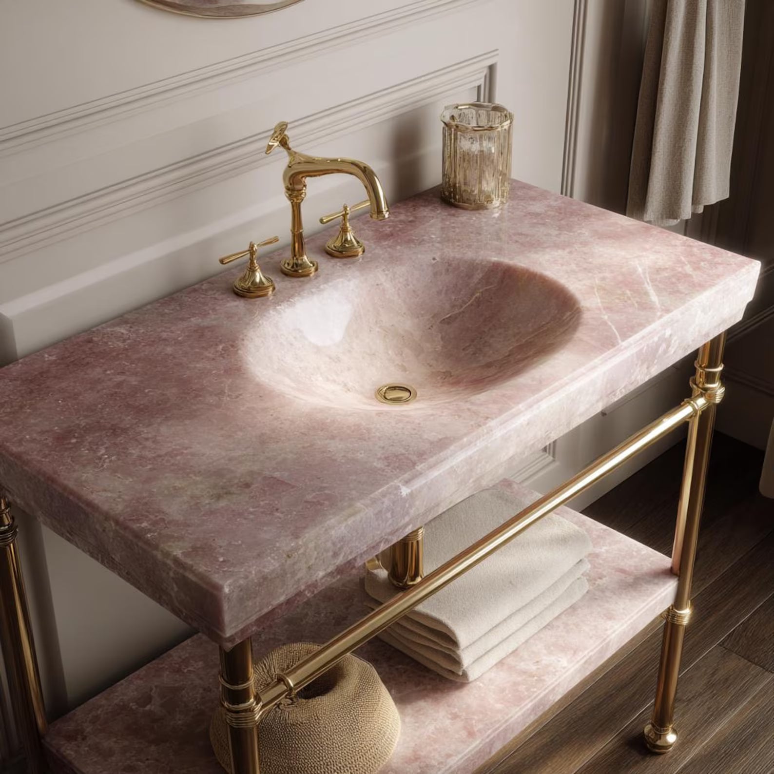 This handcrafted vanity is more than a functional fixture—it is a statement of elegance and craftsmanship. Each piece is carved from a single marble block, ensuring a unique work of art for your bathroom. Its luminous stone surface paired with sleek brass legs creates a luxurious focal point, ideal for upscale homes, boutique hotels, or spa-inspired interiors. With fully customizable dimensions, finishes, and stone options, this marble console brings timeless beauty, modern practicality, and an unparalleled sense of sophistication to your space.
