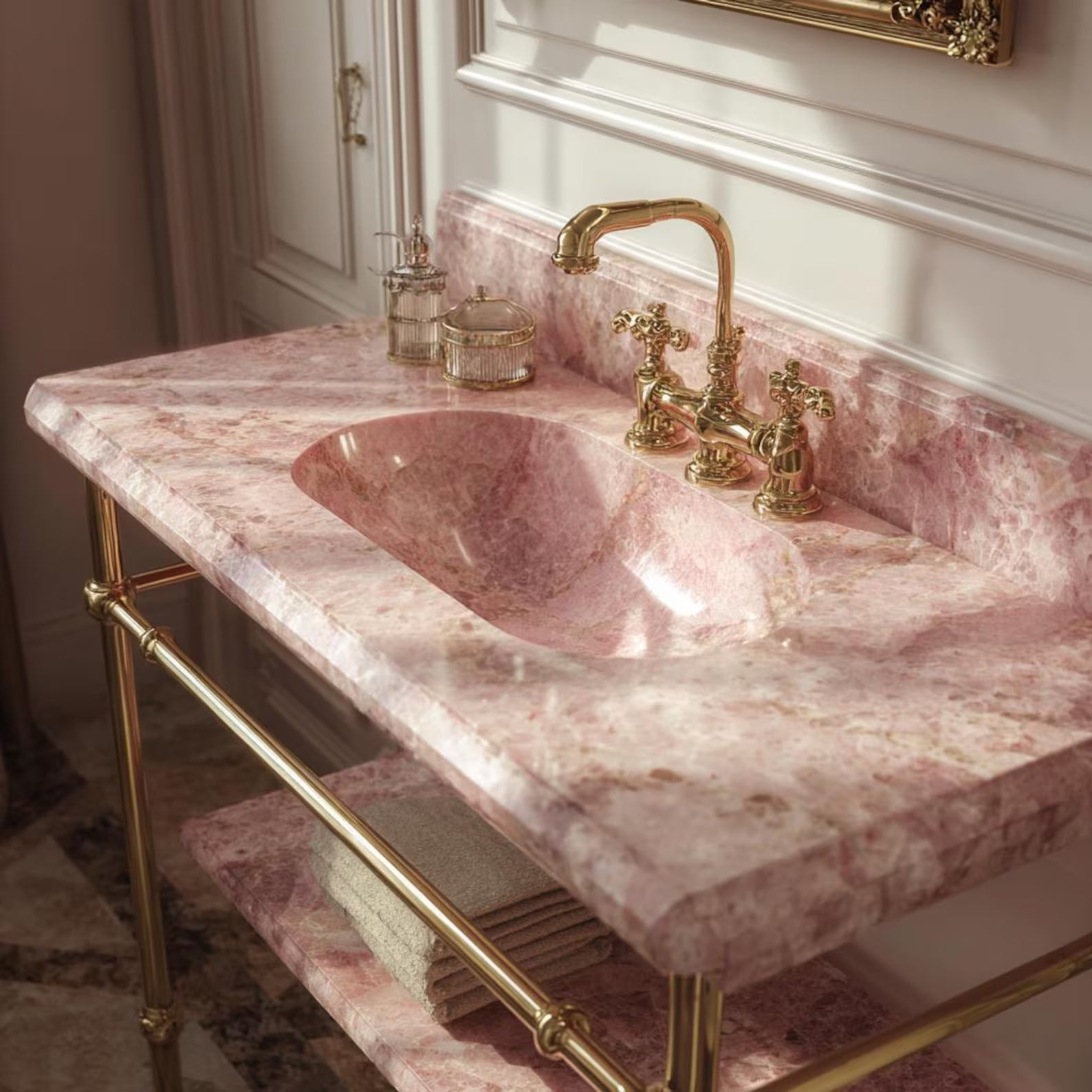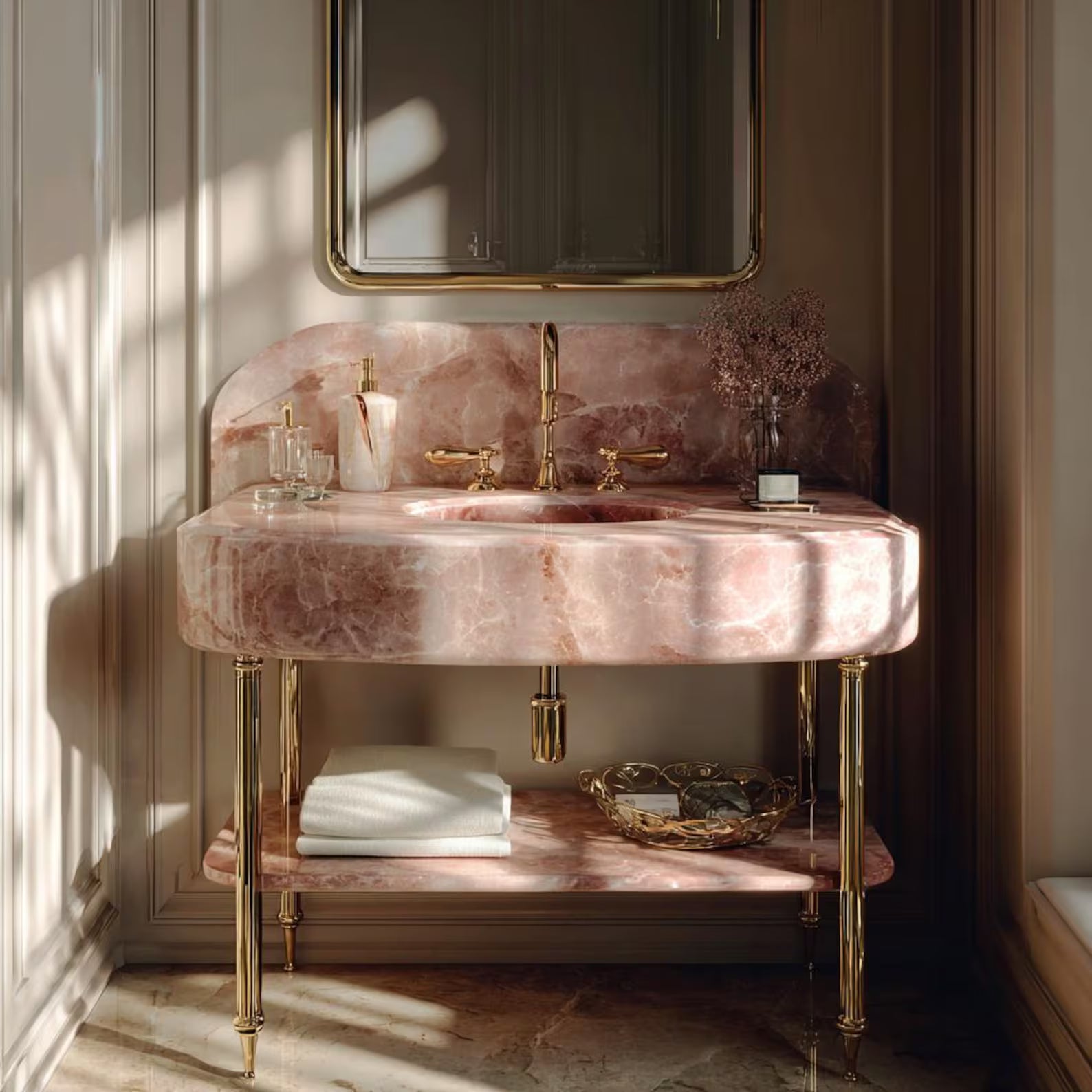 Elevate your bathroom with this luxurious Rose Quartz Marble Vanity Sink Console. Expertly crafted from 100% natural pink onyx marble, the vanity features soft pink and honey veining that creates a timeless, sophisticated look. Its polished finish enhances the natural beauty of the stone, making it a striking centerpiece for both modern and classic interiors.