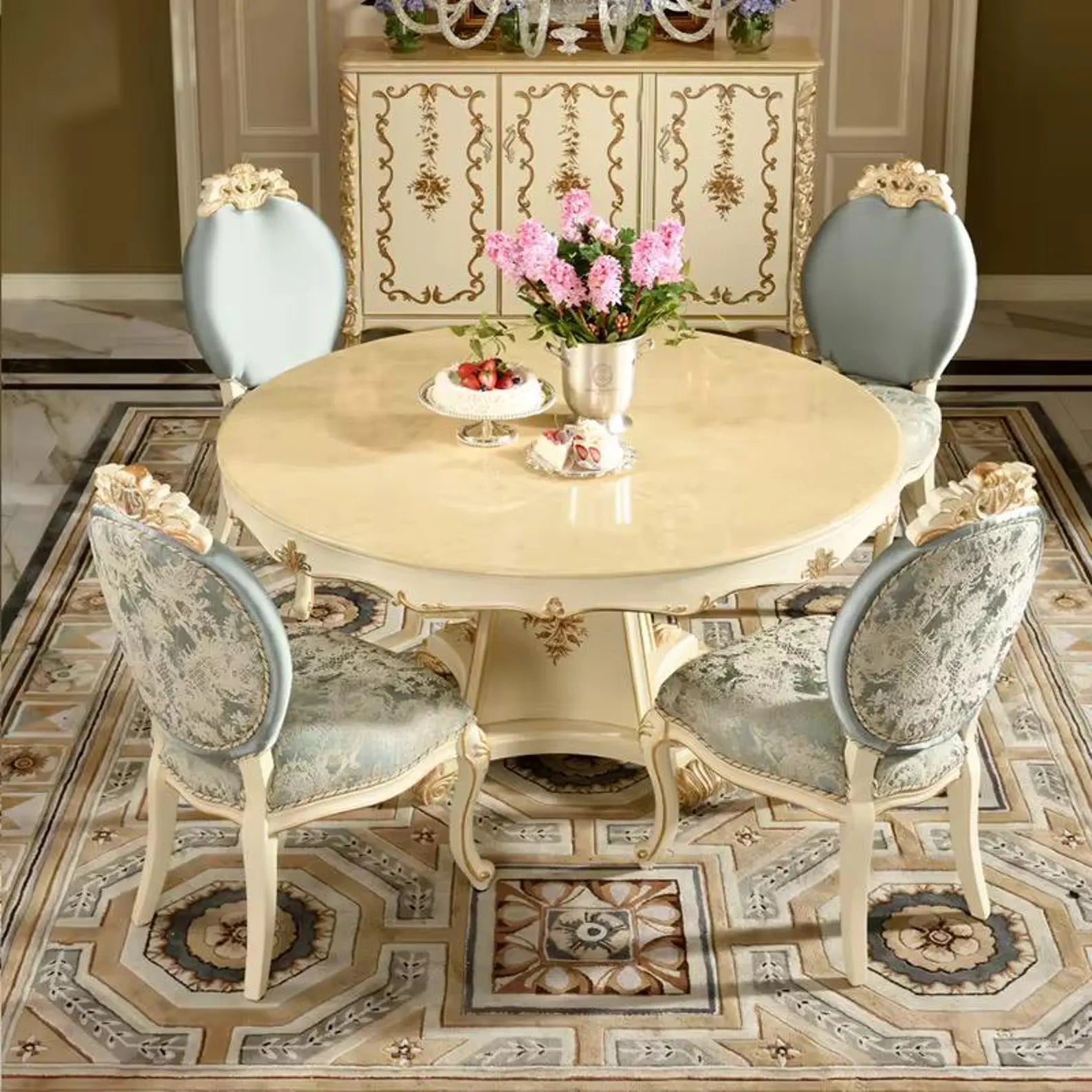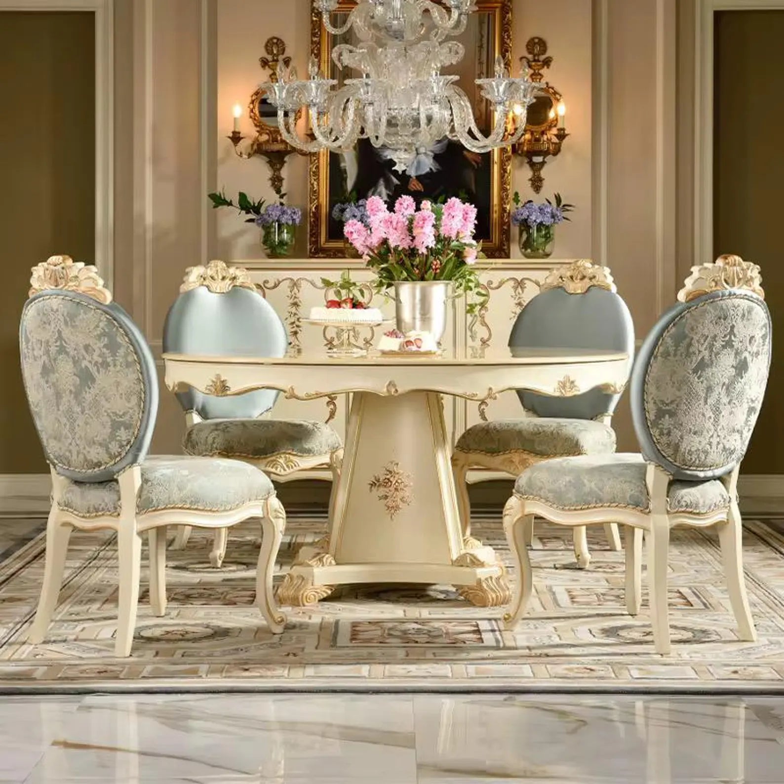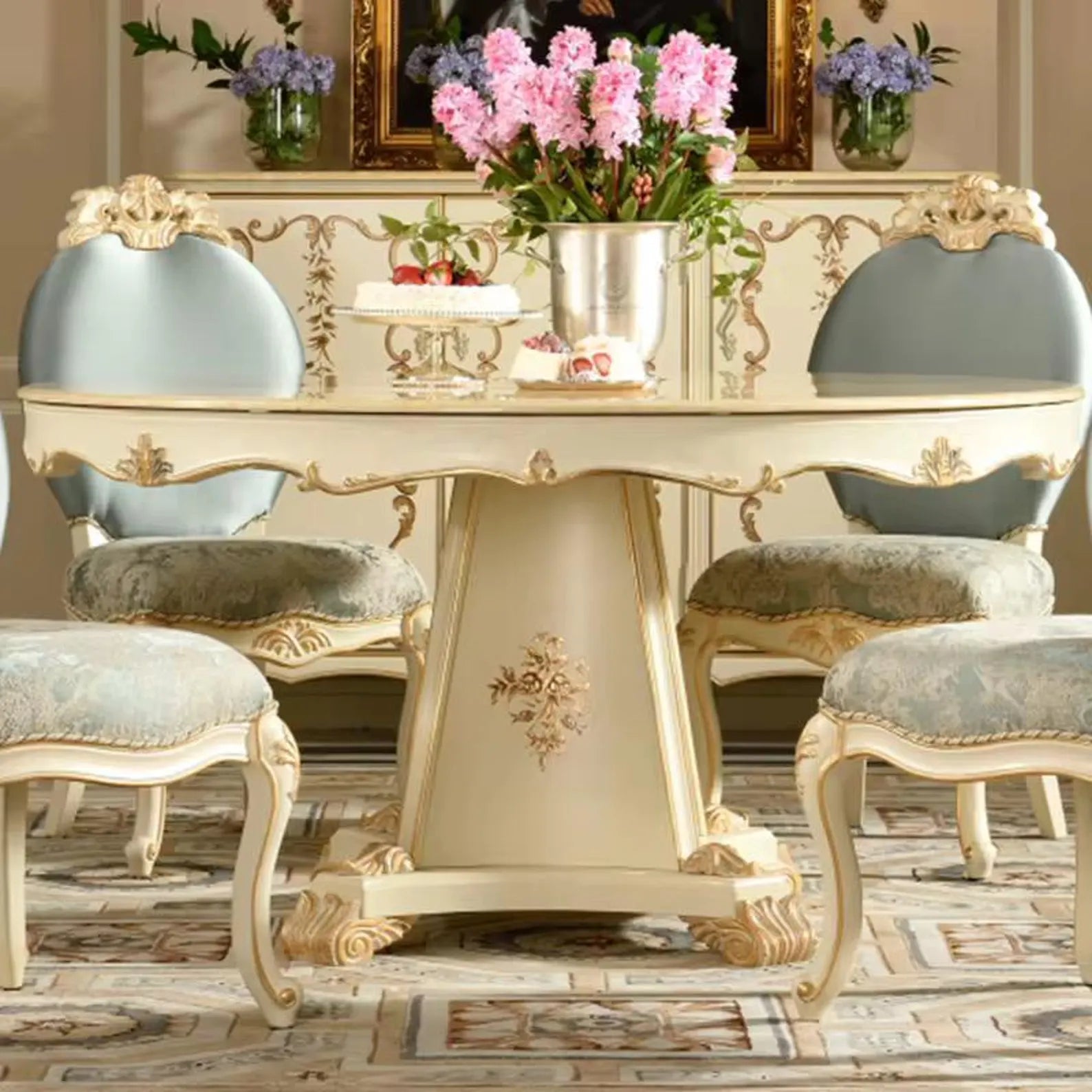 Bring classic European sophistication into your home with this Round Dining Table and French-Style Wood Dining Chairs Set, inspired by Baroque Rococo design. Featuring intricate hand-carved details, refined gold accents, and a soft ivory finish, this ornate dining set elevates both formal dining rooms and luxury interiors.