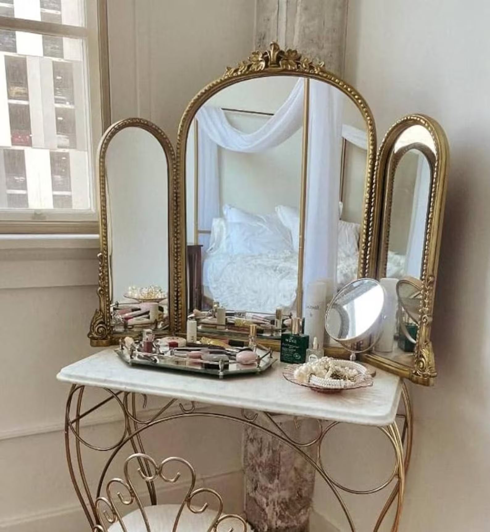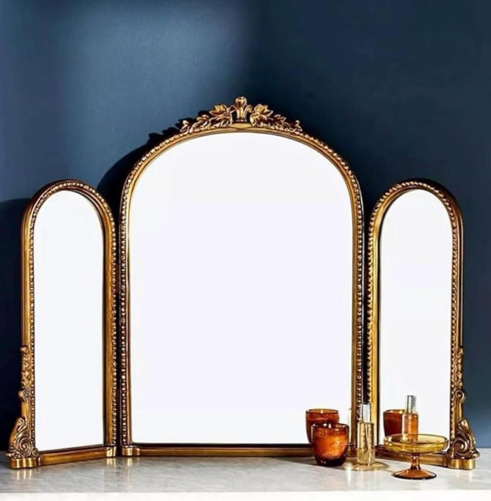 Crafted for those who appreciate luxury and refined craftsmanship, this Tri-Fold Mirror combines decorative artistry with practical functionality. The folding panels provide adjustable angles, perfect for applying makeup, styling hair, or admiring your décor from multiple perspectives. With its ornate Baroque frame, durable materials, and vintage elegance, this decorative mirror is a luxurious statement piece that enhances both the beauty and sophistication of any room.