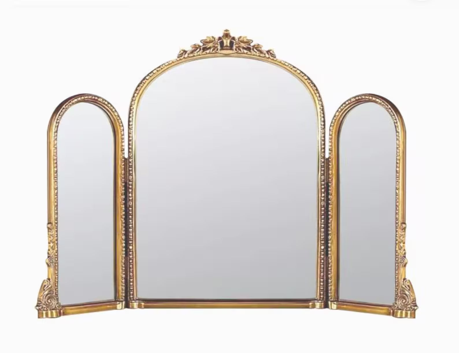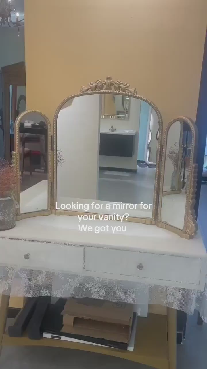 Enhance your home décor with this exquisite Tri-Fold Vanity Mirror, featuring a vintage Baroque-inspired arched frame. Designed for both elegance and functionality, its three-panel folding structure allows adjustable angles for the perfect reflection, making it ideal for vanities, dressing areas, or bedrooms. The antique gold frame, adorned with intricate Victorian detailing, adds timeless sophistication and charm to any space.