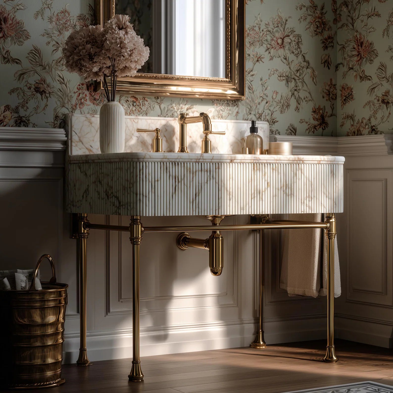 🛁 Design: Vanity-style base with brass legs & integrated sink basin